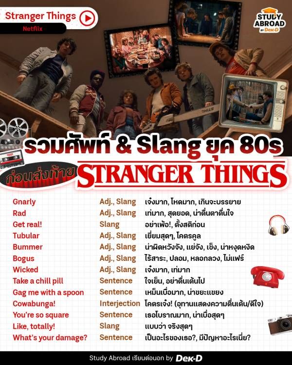 เป็นยังไงกันบ้างคะ รู้สึกเหมือนได้ตะลุยโลกย้อนกลับไปเหมือนอยู่ใน Stranger Things เลยเนอะ ทั้งศัพท์ ทั้งฟีล ทั้งความวินเทจ ช่วยเพิ่มความอินกับซีรีส์มากกว่าเดิม ที่เพิ่มเติมคือได้ความรู้ภาษาอังกฤษแบบฟีล Native ไปอีก