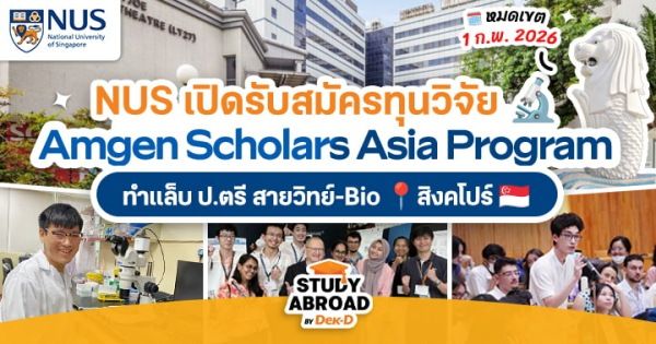 สวัสดีชาว Dek-D ทุกคนค่า~ สำหรับน้องๆ ป.ตรีสายวิทย์ ไม่ว่าจะสาขาชีววิทยา เทคโนโลยีชีวภาพ ชีวการแพทย์ หรือด้านวิทย์อื่นๆ ที่ทำงานในห้องแล็บ ถ้าอยากขยับไปหาประสบการณ์ทำแล็บระดับอินเตอร์ วันนี้พี่ลูกหมูจะพาไปรู้จัก ‘Amgen Scholars Asia Program 2026’ โครงการทุนวิจัยของ National University of Singapore (NUS) ซึ่งกำลังเปิดรับสมัครในตอนนี้กันค่ะ