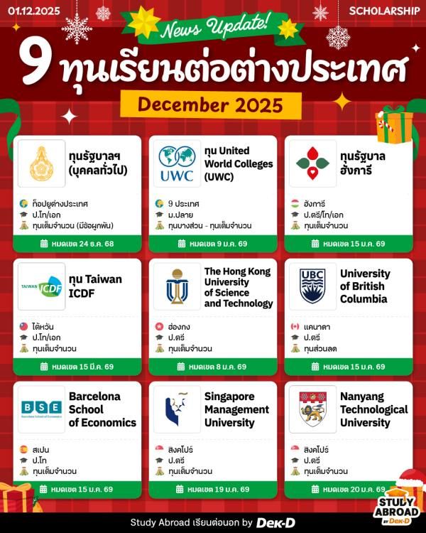 เผลอแปบเดียวก็เดินทางมาถึงเดือนสุดท้ายของปีกันแล้ว สำหรับใครที่ตั้งโกลในปีหน้าว่าจะไปเรียนต่อต่างประเทศ วันนี้ Study Abroad by Dek-D เลยขอมามอบของขวัญ สรุปข้อมูล 9 ทุนดังสำหรับ #ทีมต่อนอก ซึ่งบอกเลยว่าตลอดเดือนนี้มีหลายทุนเปิดรับสมัครกันอย่างคึกคัก แถมบางทุนก็มอบแบบไม่กั๊ก มีโควตาพิเศษสำหรับคนไทยด้วยนะ!