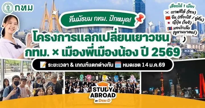 สวัสดีค่ะชาว Dek-D น้องๆ มัธยมคนไหนกำลังมองหาโอกาสไปแลกเปลี่ยนต่างประเทศระยะสั้น แบบไม่ต้องใช้งบก้อนใหญ่ ข่าวดีคือในปี 2569 ทางกรุงเทพมหานครเปิดรับสมัคร โครงการแลกเปลี่ยนเยาวชน กทม. × เมืองพี่เมืองน้อง พาน้องๆ ที่มีทะเบียนบ้าน หรือ อยู่ในโรงเรียนสังกัด กทม. ไปใช้ชีวิตและทำกิจกรรมร่วมกับเยาวชนต่างชาติใน เมืองต่างๆ ในภูมิภาคเอเชีย โดยที่น้องๆ รับผิดชอบเฉพาะค่าใช้จ่ายส่วนตัวและเอกสารเดินทางเท่านั้น