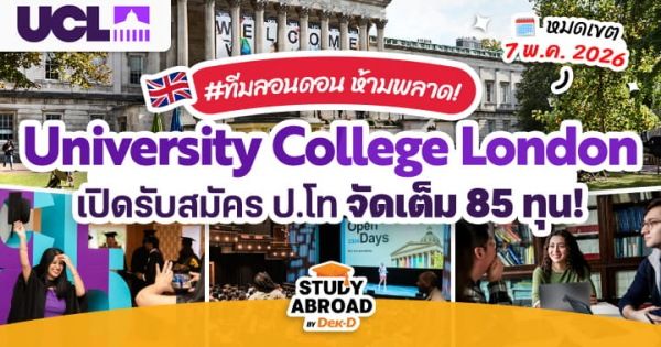 และสำหรับชาว Dek-D ที่กำลังมองหาทุน ป.โท อยู่ ตอนนี้ ‘University College London’ หรือ ‘UCL’ มหาวิทยาลัยชั้นนำของประเทศ กำลังเปิดรับสมัครทุนส่วนลดค่าเล่าเรียน ‘UCL Global Master's Scholarship’ ประจำปี 2026/27 อยู่ มูลค่าทุนจะปังแค่ไหน? และใครสมัครได้บ้าง? ตามไปอ่านต่อด้านล่างได้เลยค่ะ