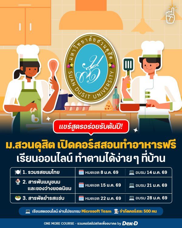 เริ่มต้นปีแบบนี้ ใครอยากอัปสกิลทำอาหารเพิ่มเสน่ห์ปลายจวัก เติมความสุขให้ครัวคึกคักตั้งแต่เดือนแรกของปีบ้าง? วันนี้ One More Course ขอชวนทุกคนมาเข้าครัวแบบชิลๆ เรียนคอร์สออนไลน์ฟรีกับ โรงเรียนการเรือน มหาวิทยาลัยสวนดุสิต ที่เปิดวิชาใหม่ต้อนรับเดือนมกราคม 69 มาพร้อมเมนูเด็ดให้จดสูตรกันแบบครบจบทั้งคาวและหวาน เช่น ขนมถ้วย ขนมหัวล้าน ข้าวเกรียบปากหม้อ ซาลาเปา ยำส้มโอกุ้งสด ไอศกรีมมะยงชิด และอีกมากมายหลายเมนู