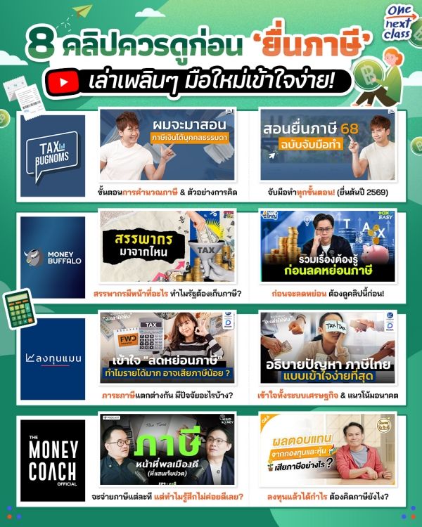 และสำหรับใครที่เพิ่งยื่นปีแรก หรือเคยยื่นแล้วแต่ยังสับสนกับขั้นตอนอัปเดตปีล่าสุด วันนี้ One Next Class #ชีวิตติดเรียนรู้ ได้มัดรวม 8 คลิปจากกูรูตัวจริงที่จะมาเล่าเรื่องภาษีแบบย่อยง่ายๆ เข้าใจสาระสำคัญครบทุกประเด็น! // ดูจบแล้ว รับรองเลยว่าการยื่นภาษีจะไม่ใช่เรื่องยากอีกต่อไปปป~