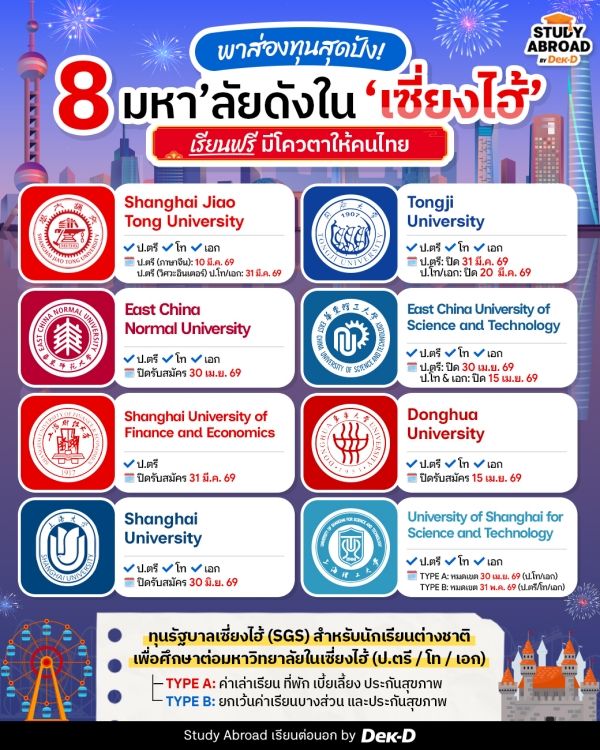 และสำหรับใครที่ฝันอยากไปเรียนต่อที่เซี่ยงไฮ้ รู้ไหมว่าในทุกปีจะมี ‘ทุนรัฐบาลเซี่ยงไฮ้’ ที่มอบทุนเรียนต่อให้นักเรียนจากทั่วโลก ซึ่งก็ครอบคลุมมหาวิทยาลัยทั่วนครเซี่ยงไฮ้ สำหรับใครที่อยากรู้ว่าช่วงนี้มีที่ไหนกำลังเปิดรับสมัครอยู่บ้าง หรือกำลังเล็งๆ ม.ไหนไว้อยู่ รีบตามมาคว้าโอกาสเรียนฟรีที่แดนมังกรกันเลยค่า~