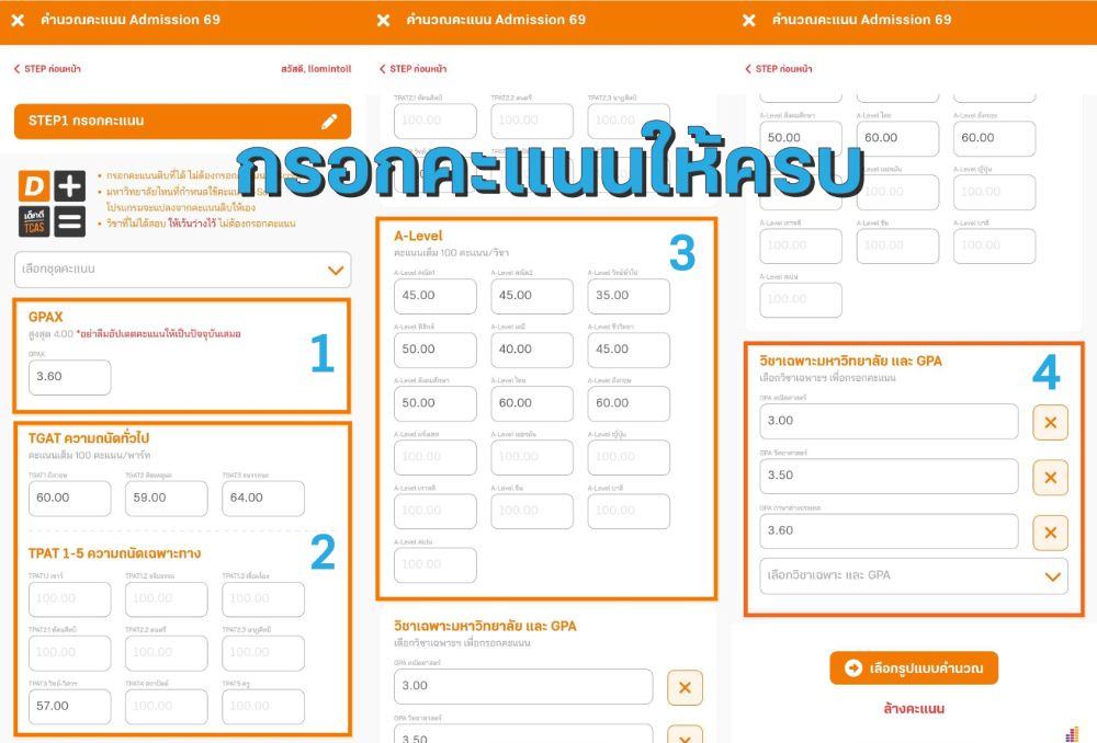 - กรอกคะแนนที่จำเป็น หากมีคะแนนแล้วให้ใส่คะแนนจริง หากยังไม่มีให้ใส่คะแนนจำลอง (คะแนนที่คิดว่าตัวเองจะทำได้)