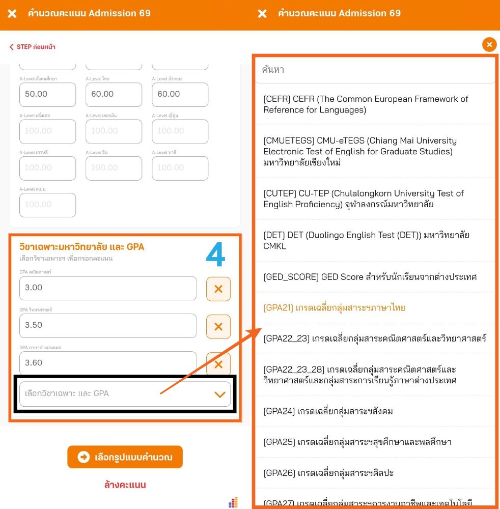 ในขั้นตอนนี้ จะมีช่องให้กรอกคะแนนอยู่ 4 จุด คือ เกรดเฉลี่ยสะสม, คะแนน TGAT/TPAT, คะแนน A-Level และคะแนนอื่น
