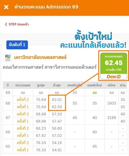 สิ่งที่น้องๆ จะต้องดูคือ เทียบคะแนนของตนเองกับคะแนนต่ำสุดครั้งที่ 2 ของสถิติแต่ละปี และดูว่าคะแนนเราได้มากกว่าปีที่แล้วมั้ย หรือถ้ายัง ขาดอีกกี่คะแนน