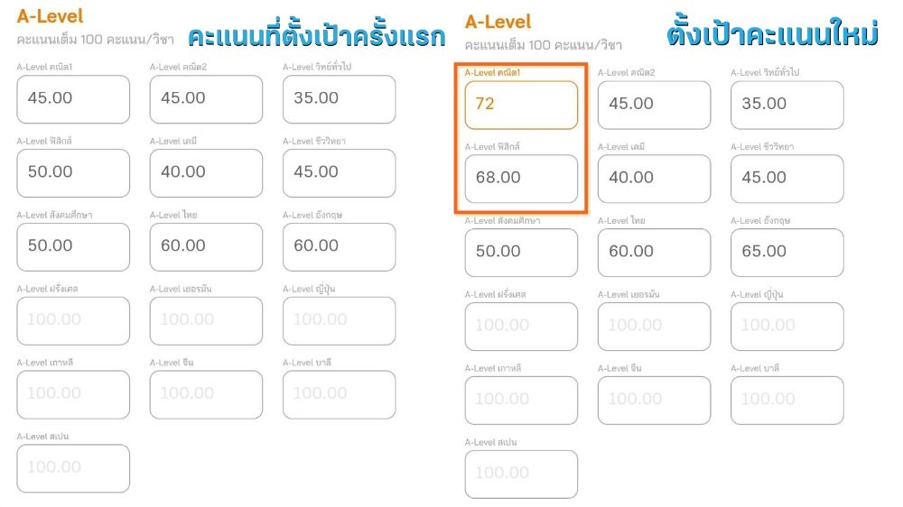 - หากได้คะแนนมากกว่า แปลว่า ตัวเลขคะแนนที่สมมติไว้โอเคแล้ว ให้กลับไปตั้งใจเตรียมตัวสอบ ส่วนคณะที่คำนวณคะแนนออกมาแล้วยังน้อยกว่า หมายความว่าคะแนน A-Level ที่สมมติไว้ยังไม่เพียงพอ