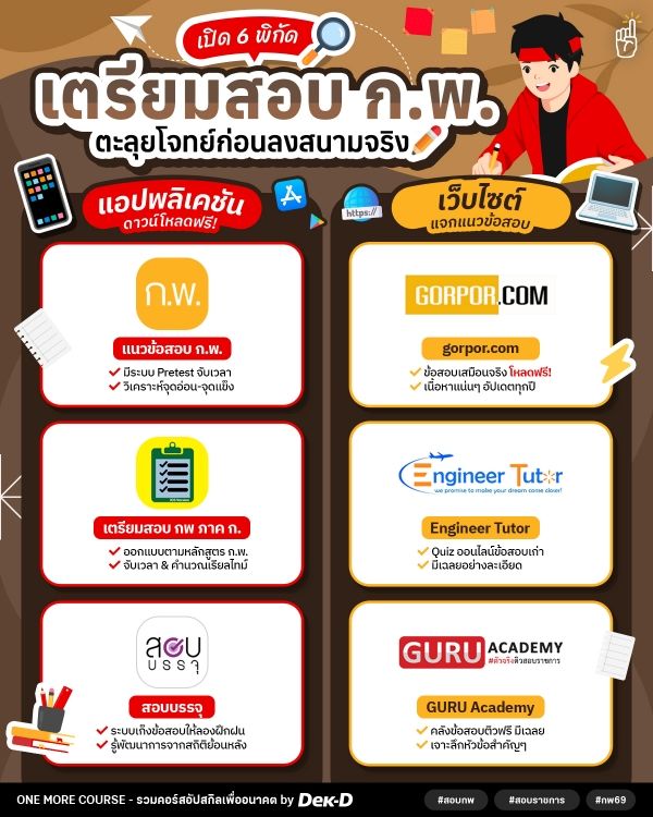 วันนี้ One More Course มีตัวช่วย 6 แหล่งฝึกทำข้อสอบ ก.พ. ทั้งรูปแบบแอปพลิเคชันและเว็บไซต์มาให้ทุกคนได้ตามไปฝึกฝน วัดระดับ และอัปสกิลก่อนลงสนามจริงกันแบบจุกๆ // ว่าแล้วก็ตามไปตะลุยพร้อมกันเลยยย~