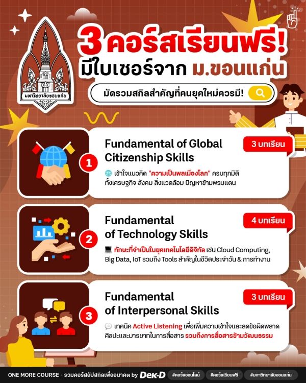 วันนี้ One More Course มาชี้เป้า 3 คอร์สเรียนฟรีจาก “มหาวิทยาลัยขอนแก่น” ที่ได้รวบตึงทักษะและความรู้พื้นฐานที่คนยุคใหม่ควรมีติดตัวไว้ ซึ่งจะช่วยปิดจุดอ่อนและเสริมความรู้ให้โดดเด่นรอบด้าน ทั้งการตระหนักรู้ความเป็นพลเมืองโลก ทักษะการใช้เทคโนโลยี และสกิลการสื่อสารที่ปรับใช้ได้กับทุกสถานการณ์ชีวิต อัปเกรดสู่การเป็นมนุษย์ที่ AI มาแทนไม่ได้ // ไปส่องรายละเอียดแล้วลงทะเบียนไว้เลย!