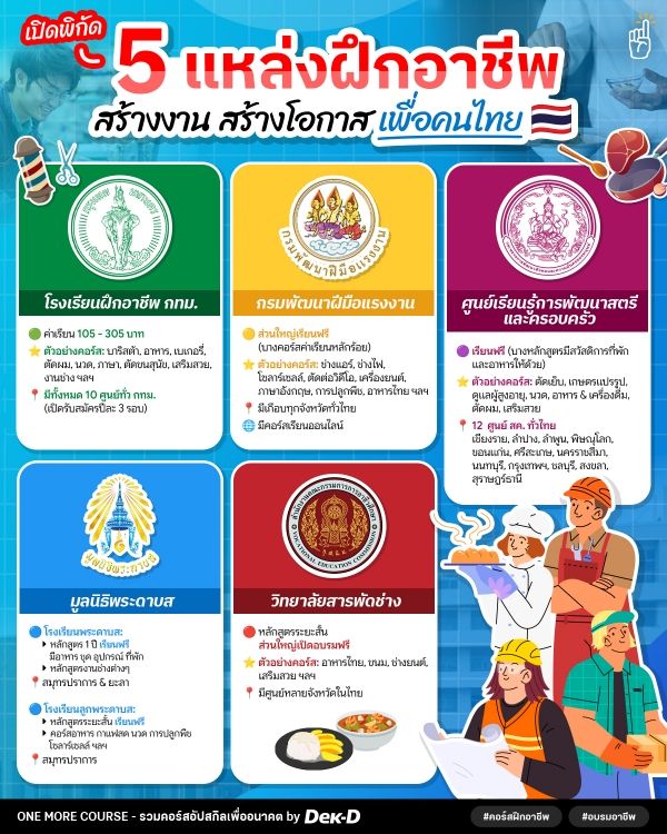 เบื่องานเดิม? อยากหาอาชีพเสริม? หรือช่องทางสร้างรายได้ใหม่ๆ? ต้นปีแบบนี้ใครที่อยากเริ่มต้นเรียนรู้อะไรใหม่ๆ วันนี้ One More Course ขอพาไปเปิดพิกัด 5 แหล่งเรียนรู้เพื่อสร้างงาน สร้างอาชีพ สร้างโอกาสสำหรับคนไทย ซึ่งส่วนใหญ่เปิดให้เรียนฟรี หรือบางทีอาจมีค่าใช้จ่ายแค่เพียงหลักร้อยเท่านั้น