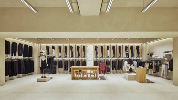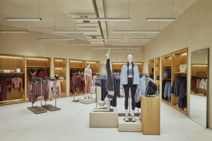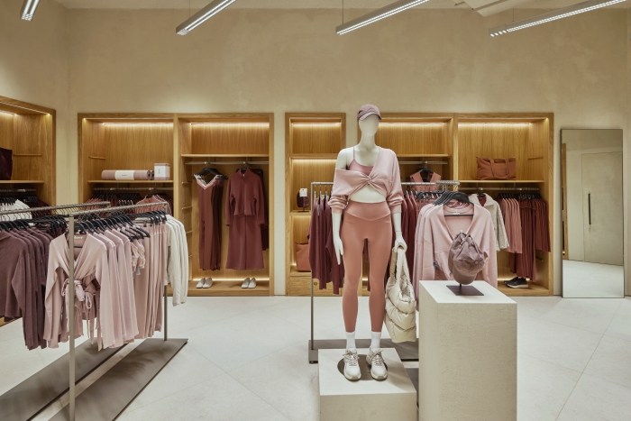ด้านโครงสร้างสถาปัตยกรรมและวัสดุ ความอบอุ่น ผิวสัมผัสจากธรรมชาติ และแสงสว่าง คือองค์ประกอบสำคัญ ภายในร้านจึงเลือกใช้เป็นพื้นกระเบื้องพอร์ซเลนเพื่อให้เข้ากับวัสดุที่คัดสรรมาอย่างพิถีพิถัน โซนต้อนรับโดดเด่นด้วยผนัง earth-block งานแฮนด์คราฟต์ สะท้อนตัวตนของแบรนด์และชูภาพลักษณ์ความเป็นแบรนด์ผู้นำเทรนด์ Athleisure ตั้งแต่ก้าวแรกที่เข้าสู่ร้าน