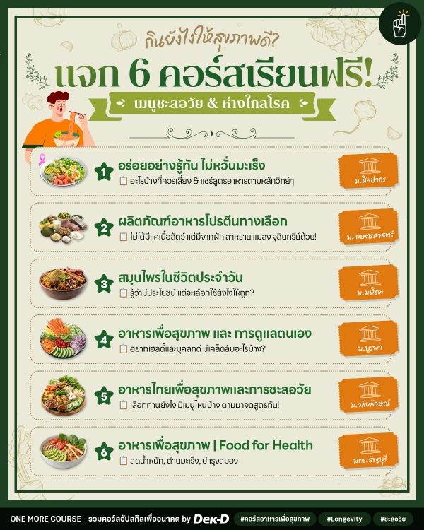 ยิ่งช่วงนี้เทรนด์ Longevity ที่มาแรงอย่างต่อเนื่อง ถ้าใครอยากหันมาดูแลเรื่องอาหารการกินให้ดีต่อร่างกายในระยะยาว วันนี้ One More Course ขอมาแจก 6 คอร์สสายเฮลตี้ ที่จะมาแชร์เคล็ดลับในการเลือกทานอาหารแบบต่างๆ ซึ่งจะช่วยให้เรามีสุขภาพที่ดีและห่างไกลโรคมากขึ้น จะมีเรื่องอะไรที่เรามองข้ามไปบ้าง? ตามมาจดกันเลย!