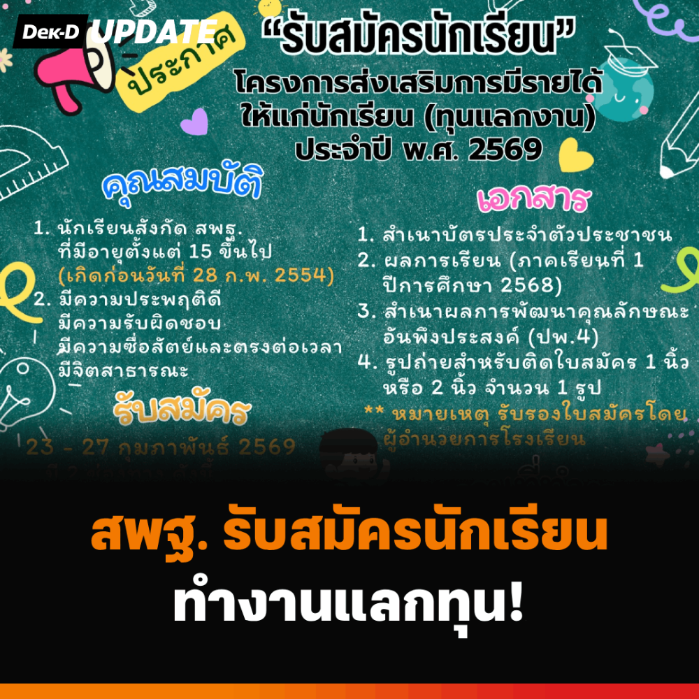 สพฐ. ประกาศรับสมัครนักเรียนเข้าร่วมโครงการส่งเสริมการมีรายได้ให้แก่นักเรียน (ทุนแลกงาน) ในช่วงปิดเทอม เพื่อเพิ่มโอกาสในการศึกษาต่อให้แก่นักเรียน ได้รับประสบการณ์จากการทำงานจริงและเตรียมตัวเข้าสู่การทำงานในอนาคต ได้ใช้เวลาว่างให้เกิดประโยชน์ ฝึกวินัย ความรับผิดชอบและการตรงต่อเวลา และเพื่อให้นักเรียนมีรายได้ในช่วงปิดภาคเรียน ช่วยแบ่งเบาภาระของผู้ปกครอง เห็นคุณค่าของเงิน คุณค่าของงานและมีความภาคภูมิใจในการพึ่งตนเอง