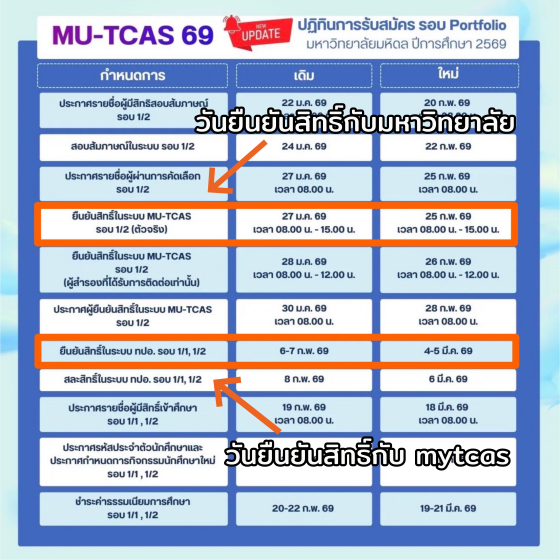 สำหรับการยืนยันสิทธิ์ TCAS69 มีกำหนดการ (อัปเดตแล้ว) แต่ละรอบ ดังนี้