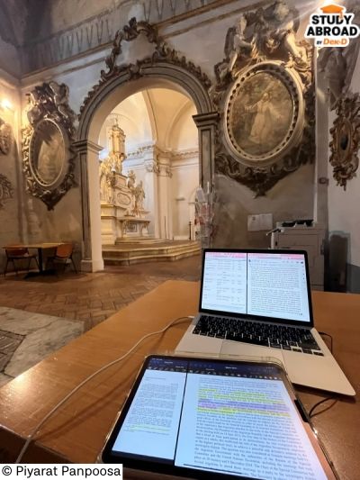 ส่วนเหตุผลที่เลือกประเทศอิตาลี เพราะตอนป.ตรี เคยเรียนภาษาอิตาเลียนที่จุฬาฯ และเคยได้ทุนรัฐบาลอิตาลีไปเรียนภาษาที่อิตาลีมาแล้ว 6 เดือนด้วย (ทุนรัฐบาลให้เรียนภาษาจริงๆ ที่ 3 เดือนค่ะ แต่เราตัดสินใจอยู่ต่อเองอีก 3 เดือน) ทำให้คุ้นเคยทั้งภาษา วัฒนธรรม และระบบการศึกษา การกลับมาเรียนต่อที่นี่จึงเป็นเหมือนการต่อยอดจากประสบการณ์เดิม มากกว่าการเริ่มต้นใหม่ทั้งหมดค่ะ