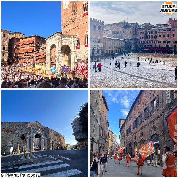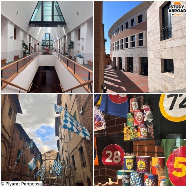 University of Siena ตั้งอยู่ที่เมืองเซียน่า (Siena) เมืองยุคกลางที่ยังคงวัฒนธรรมดั้งเดิมไว้ค่อนข้างเข้มข้น ทั้งสถาปัตยกรรม ประเพณี และวิถีชีวิตของคนในเมือง อาคารเรียนหลายแห่งเป็นอาคารเก่าแบบยุคกลาง ให้ฟีลขลัง เหมือนอยู่กลางประวัติศาสตร์จริงๆ