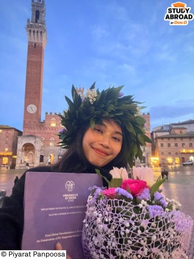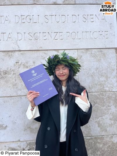 พอทำงานมาได้สักระยะ เราเริ่มกลับมาตั้งคำถามกับตัวเองว่าเส้นทางที่เดินอยู่ใช่จริงไหม เพราะถึงจะพยายามนำความชอบด้านวิชาการไปประยุกต์กับงานมาตลอด แต่พอทำงานมาหลายปี ก็เริ่มไม่แน่ใจว่าอยากเติบโตในสายนี้ต่อไปจริงหรือเปล่า สุดท้ายก็ตกผลึกว่าจริงๆ เรายังผูกพันกับพื้นฐานด้านประวัติศาสตร์และรัฐศาสตร์อยู่มาก ซึ่งจริงๆ แล้วสาขานี้เป็นหนึ่งใน Goal ตอนเรียนมัธยมค่ะ แต่ตอนนั้นเราเลือกเรียนอักษรศาสตร์แทน ทีนี้เราก็กลับไปนึกถึงเป้าหมายในช่วงตอนมัธยม และยังผูกพันธ์กับพื้นฐานด้านประวัติศาสตร์ รวมถึงอยากมีโอกาสเรียนรู้ทักษะด้านอื่นๆ บวกกับอยากเปิดโอกาสที่มากขึ้นให้กับตัวเอง เลยตัดสินใจกลับมาเรียนต่อปริญญาโท สาขา ‘International Studies’ ที่ ‘University of Siena’ ประเทศอิตาลี