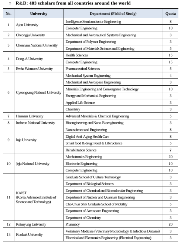 1) ทุน R&D (Research and Development) จำนวน 403 ทุนสำหรับผู้สมัครทั่วโลก โดยแต่ละมหาวิทยาลัยจะกำหนดจำนวนโควตารับทุนแตกต่างกัน เบื้องต้นมีมหาวิทยาลัยที่เข้าร่วม 25 แห่ง ดังนี้