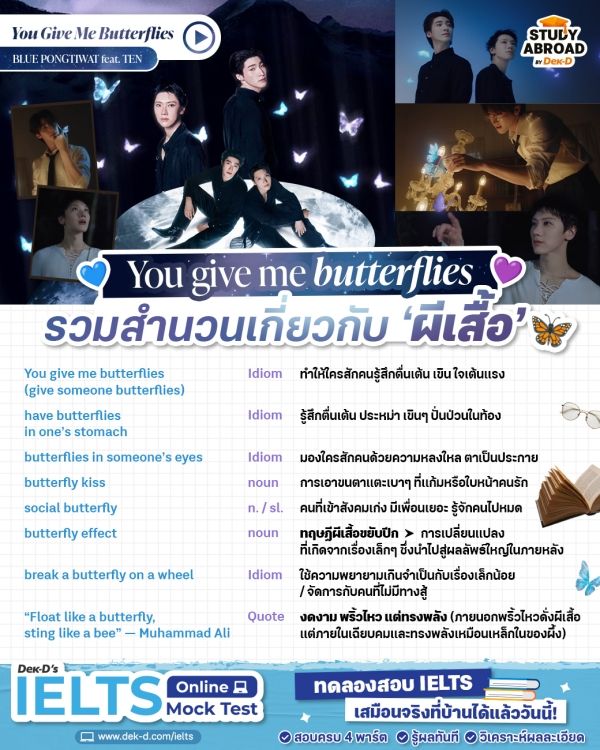 เห็นมั้ยฟังแค่เพลงเดียว แต่สามารถแตกสำนวนเกี่ยวกับผีเสื้อได้หลายประโยคเลย (บางสำนวนก็อาจเจอได้ทั้งในข้อสอบและสถานการณ์จริงด้วยนะ) สำหรับวาเลนไทน์นี้ใครกำลังหาเพลงรักหวานๆ ละมุนๆ เอาไว้อัปสตอรี่หรืออัปลงโน้ตไอจีแทนความรู้สึก พี่ก็แนะนำเพลง You Give Me Butterflies ของ BLUE กับ TEN เลยครับบ // อย่าลืมไปปั่นวิวกันด้วยน้า~