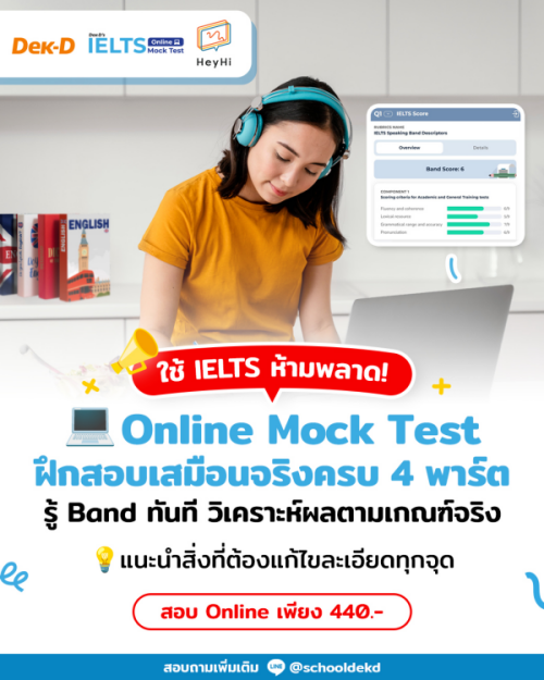 แต่บอกเลยว่าไม่ต้องกังวลไป เพราะตอนนี้ทุกคนสามารถฝึกทำข้อสอบเสมือนจริงได้แล้วที่ Dek-D's IELTS Online Mock Test จัดเต็มข้อสอบครบทั้ง 4 พาร์ต ฝึกทำออนไลน์ที่บ้านได้ง่ายๆ พร้อมรับ feedback จริง ช่วยให้รู้จุดเด่นและจุดที่ต้องพัฒนาต่อ บูสต์ความมั่นใจก่อนเจอของจริง! // ค่าสอบเพียง 440 เท่านั้น~