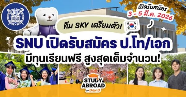 안녕! มีชาว Dek-D คนไหนกำลังมองหาทุนเรียนต่อ ป.โท หรือ ป.เอก ที่ประเทศเกาหลีใต้อยู่บ้างไหมคะ? ล่าสุดมหาวิทยาลัยอันดับ 1 ของประเทศอย่าง ‘Seoul National University’ หรือ ‘โซลแด’ เตรียมเปิดรับสมัครนักศึกษาใหม่สำหรับเทอม Fall 2026 ระหว่างวันที่ 3 - 5 มี.ค.นี้แล้ว ที่สำคัญคือมีทุนเต็มจำนวนให้ยื่นสมัครด้วย อย่ารอช้า รีบตามไปศึกษารายละเอียดกันเลยค่ะ