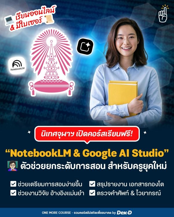 วันนี้ One More Course ขอมาป้ายยา หลักสูตร “NotebookLM & Google AI Studio คู่ซี้อาจารย์ยุคใหม่ เกียมสอนสุดง่าย วิจัยสุดปัง!” #คอร์สเรียนฟรี จัดสอนทำโดยอาจารย์คณะนิเทศศาสตร์ จุฬาฯ ซึ่งจะมาแชร์เทคนิคการใช้ AI Tools ที่สามารถช่วยเตรียมการสอนได้ง่ายขึ้น ไม่ว่าจะงานเอกสาร งานวิจัย เขียนรายงาน หรือจะใช้ตรวจคำศัพท์-ไวยากรณ์ภาษาอังกฤษ ก็ช่วยได้เหมือนมี TA อยู่ข้างๆ เลยล่ะ~ // มีใบเซอร์ให้ด้วยนะ!