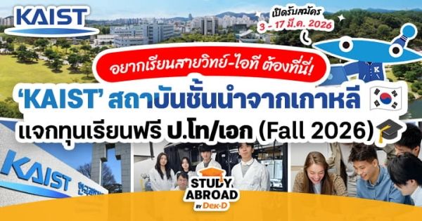 안녕! สวัสดีชาว Dek-D ทุกคนค่ะ ช่วงนี้หลายมหาวิทยาลัยในเกาหลีใต้ทยอยประกาศระเบียบการรับสมัครนักศึกษาใหม่สำหรับเทอม Fall 2026 กันแล้ว หนึ่งในนั้นคือ KAIST สถาบันดังด้านวิทยาศาสตร์และเทคโนโลยี ซึ่งจะเปิดรับสมัครระดับ ป.โท และ ป.เอก รอบ Regular ระหว่างวันที่ 3 - 17 มี.ค.นี้ ความปังคือผู้สมัครทุกคนมีโอกาสได้ ทุนเรียนฟรีพร้อมค่าครองชีพด้วย! รอบนี้จะเปิดรับสาขาใดบ้าง ตามไปอัปเดตข้อมูลกันเลยค่ะ~