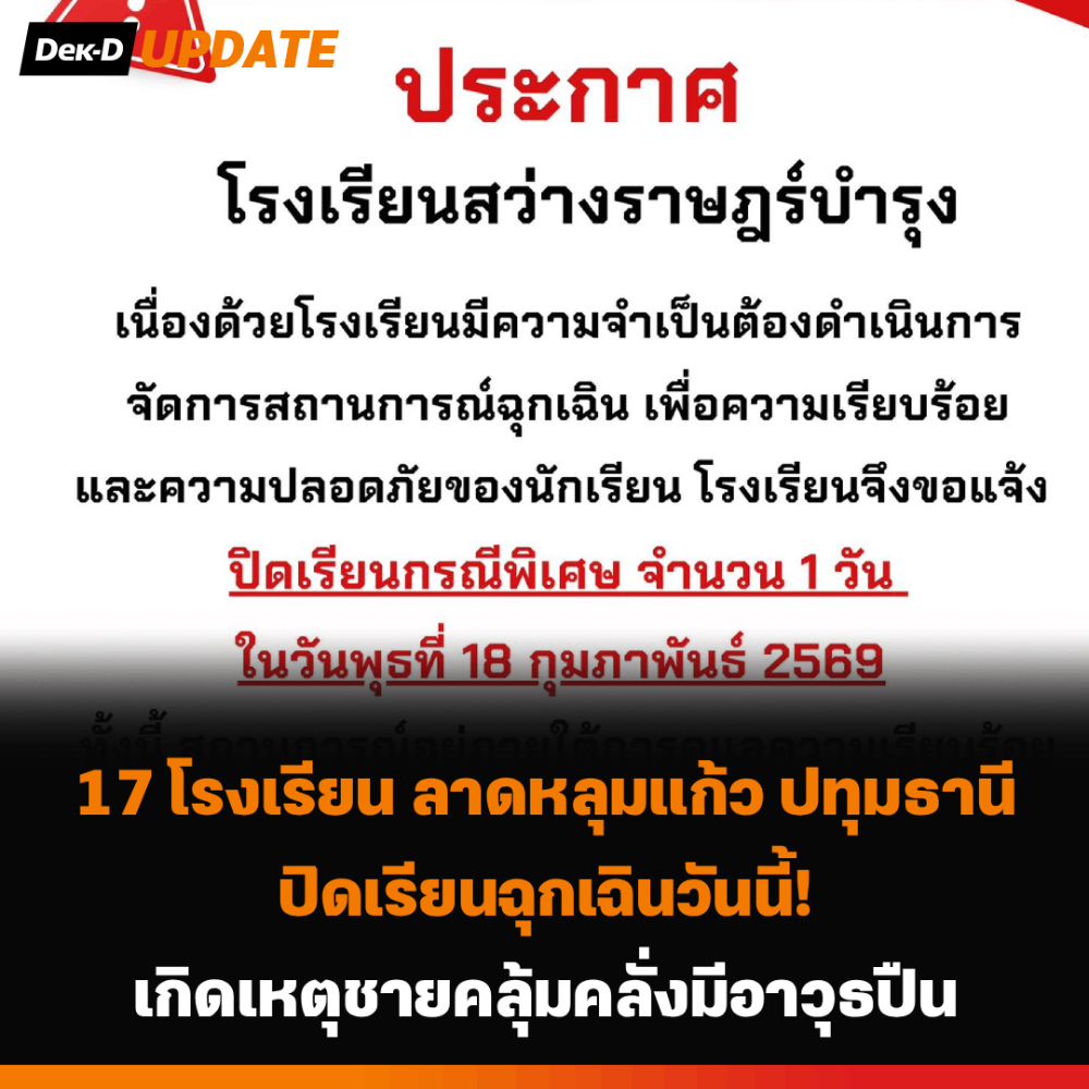 17 โรงเรียน อ. ลาดหลุมแก้ว จ. ปทุมธานี ปิดเรียนฉุกเฉิน 18 ก.พ. 69 เกิดเหตุชายคลุ้มคลั่งมีอาวุธปืน