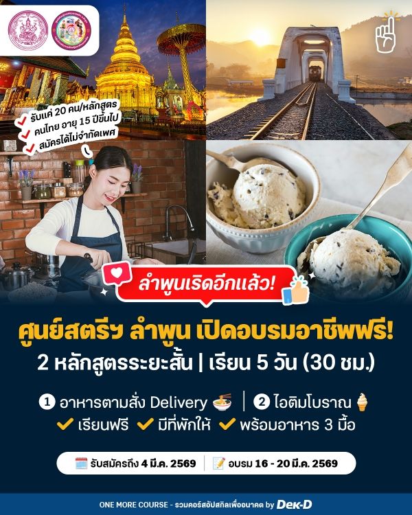 ล่าสุด One More Course ไปเจอ #ของดีอยากบอกต่อ จาก ‘ศูนย์สตรีฯ ลำพูน’ ซึ่งได้เปิด 2 หลักสูตรอบรมอาชีพระยะสั้น สำหรับคนที่สนใจเรียนทำอาหาร & เมนูไอติมโบราณ เพื่อสร้างงานสร้างอาชีพให้ตัวเอง