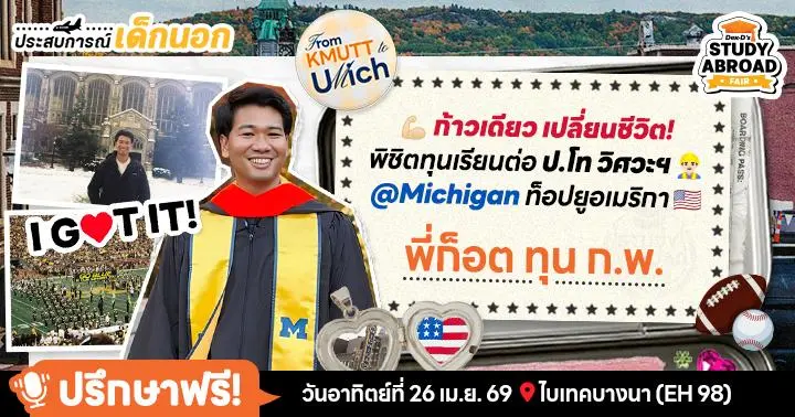 Note: เตรียมพบ "พี่ก็อต" และอีก 20+ รุ่นพี่นักเรียนทุนดีกรี Top U ทั่วโลก ที่ให้เกียรติมาประจำบูทใหญ่ในงาน Dek-D’s Study Abroad Fair เพื่อแชร์อินไซต์และให้คำปรึกษาแบบ 1:1 โดยไม่มีค่าใช้จ่าย ในวันเสาร์ที่ 25 และอาทิตย์ที่ 26 เมษายน 2026 ที่ BITEC Bangna (EH98) จัดร่วมกับงาน Dek-D’s TCAS Fair // ไม่ต้องลงทะเบียนล่วงหน้านะคะ เล็งคิวรุ่นพี่ให้ถูกวันแล้ว Walk-in ได้เลย (พี่ๆ ใจดีมากกก)