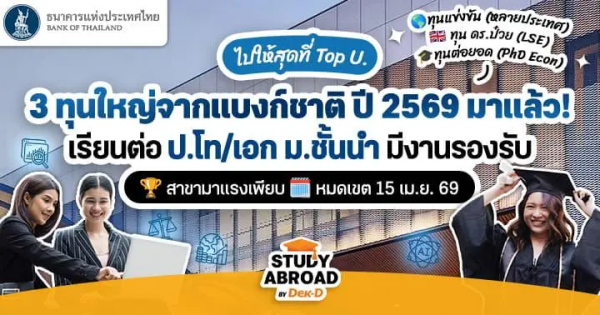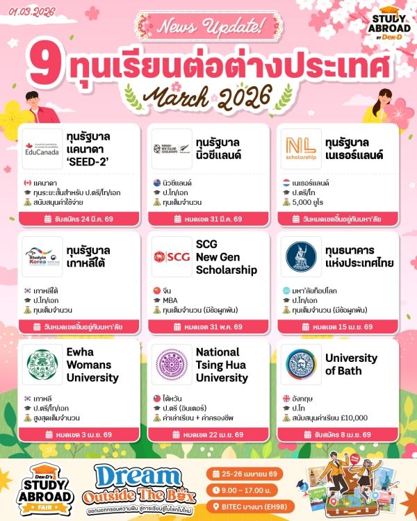 มีนาแล้ว มีทุนเยอะมาก! วันนี้ Study Abroad by Dek-D มาอัปเดต 9 ทุนเรียนต่อต่างประเทศ ที่กำลังเปิดรับสมัครอยู่ในช่วงนี้ มีทั้งทุนจากรัฐบาลประเทศต่างๆ ทุนตรงจากมหาวิทยาลัย รวมถึงทุนจากองค์กรชื่อดังระดับประเทศ // ใครไม่อยากพลาดโอกาสดีๆ แบบนี้ รีบเช็กรายละเอียด เตรียมเอกสารให้พร้อม แล้วยื่นสมัครก่อนเดดไลน์กันเล้ยยย~