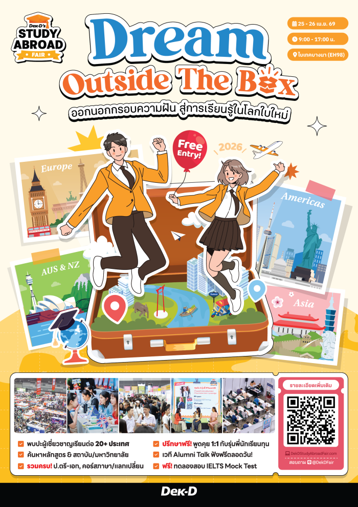กลับมาอีกครั้ง! กับงานแฟร์เรียนต่อต่างประเทศครั้งใหญ่แห่งซัมเมอร์นี้ Dek-D's Study Abroad Fair อิเวนต์รวมพลว่าที่ #ทีมเด็กนอก ไม่ว่าจะเพิ่งเริ่มต้น กำลังเก็บข้อมูลเพื่อตัดสินใจ หรืออยากหาที่ปรึกษา มางานนี้มีครบทุกตัวช่วย พร้อมสานฝันให้การเรียนต่อนอกเป็นเรื่องง่ายกว่าเดิม!