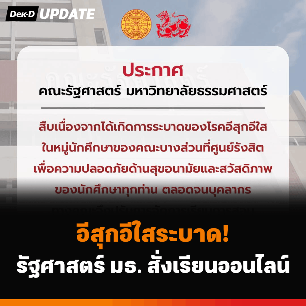 วันอังคารที่ 3 มีนาคม 2569 คณะรัฐศาสตร์ มหาวิทยาลัยธรรมศาสตร์ ศูนย์รังสิต ประกาศปรับการเรียนการสอนเป็นรูปแบบออนไลน์วันที่ 3-6 มีนาคม 2569 ทุกวิชา เนื่องจากเกิดการระบาดของโรคอีสุกอีใสในหมู่นักศึกษาของคณะบางส่วน