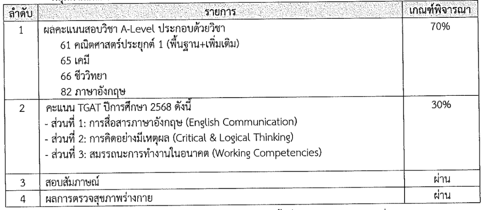- ขั้นตอนที่ 3: พิจารณารายชื่อผู้มีสิทธิ์สอบสัมภาษณ์ตามเกณฑ์ A-Level (คณิตศาสตร์ประยุกต์ 1, เคมี, ชีววิทยา, ภาษาอังกฤษ) 70% + TGAT 30%