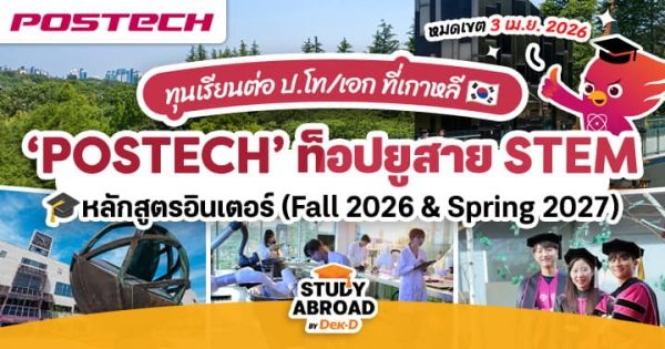 안녕! สำหรับชาว Dek-D ที่วางแผนเรียนต่อ ป.โท หรือ ป.เอก ในสาย STEM ตอนนี้ ‘POSTECH’ มหาวิทยาลัยชั้นนำในเมืองโพฮัง ประเทศเกาหลีใต้ กำลังเปิดรับสมัครนักศึกษาใหม่สำหรับเทอม Fall 2026 และ Spring 2027 แล้วนะคะ ความเริ่ดของที่นี่คือหลักสูตรส่วนใหญ่สอนเป็นภาษาอังกฤษล้วน อีกทั้งมีทุนการศึกษาให้ชาวต่างชาติด้วย รายละเอียดการรับสมัครของปีนี้จะเป็นยังไง ตามไปอัปเดตพร้อมกันเลยค่ะ!
