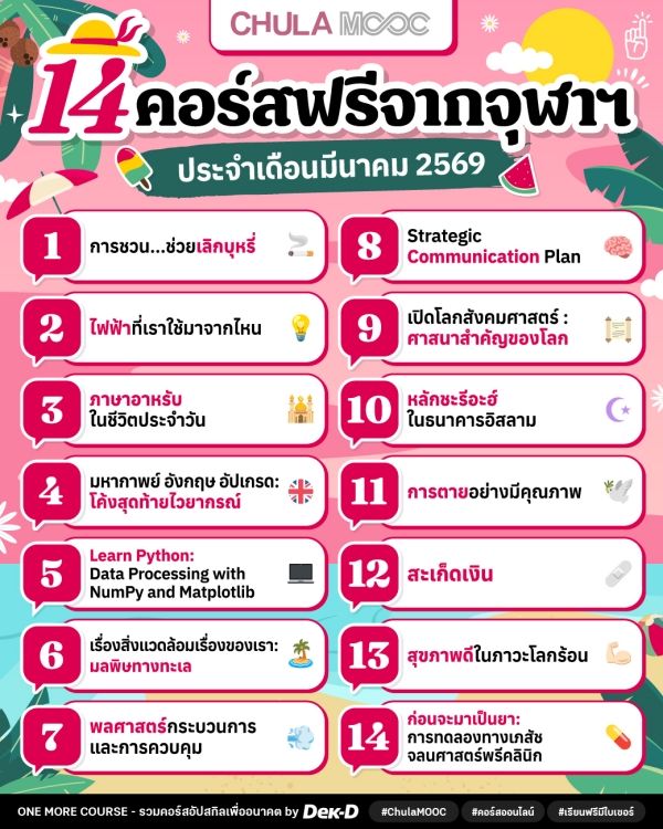 มีนานี้ มาอัปสกิลกันหน่อยมั้ย? Chula MOOC เสิร์ฟ 14 คอร์สร้อนๆ ต้อนรับ Summer!️ เดือนนี้ก็มีทุกหมวด ทั้งสายสุขภาพ ภาษา เทคโนโลยี สังคม สิ่งแวดล้อม และประเด็นสำคัญๆ ที่เป็นความรู้ต่อยอดทั้งการเรียนและการทำงานได้อย่างดี จะมีคอร์สไหนที่กำลังตามหาอยู่บ้าง รีบตามมาส่องกันเลยยย // #เรียนฟรีมีใบเซอร์ เหมือนเดิม~
