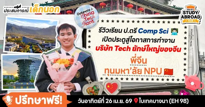 Note: เตรียมพบ "พี่จีน" และอีก 20+ รุ่นพี่นักเรียนทุนดีกรี Top U ทั่วโลก ที่ให้เกียรติมาประจำบูทใหญ่ในงาน Dek-D’s Study Abroad Fair เพื่อแชร์อินไซต์และให้คำปรึกษาแบบ 1:1 โดยไม่มีค่าใช้จ่าย ในวันเสาร์ที่ 25 และอาทิตย์ที่ 26 เมษายน 2026 ที่ BITEC Bangna (EH98) จัดร่วมกับงาน Dek-D’s TCAS Fair // ไม่ต้องลงทะเบียนล่วงหน้านะคะ เล็งคิวรุ่นพี่ให้ถูกวันแล้ว Walk-in ได้เลย (พี่ๆ ใจดีมากกก)