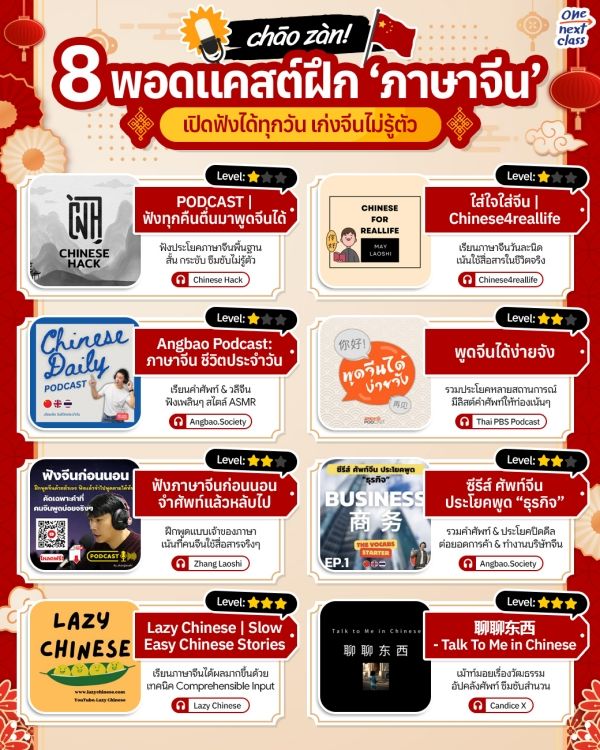 你好 ใครอยากพูดภาษาจีนให้เก่งขึ้น แนะนำให้ฝึกฟังบ่อยๆ จะได้ซึมซับทั้งคำศัพท์ สำนวน สำเนียง และประโยคสื่อสารที่คนจีนใช้จริง วันนี้ One Next Class #ชีวิตติดเรียนรู้ ขอมาเปิดพิกัด 8 รายการพอดแคสต์ฝึกภาษาจีน มาให้ทุกคนตามไปอัปสกิลทั้งการฟังและการพูด มีตั้งแต่ระดับพื้นฐานจนถึงแอดวานซ์ จะเปิดฟังตอนเดินทาง ทำงาน หรือก่อนนอนก็เริ่ด!