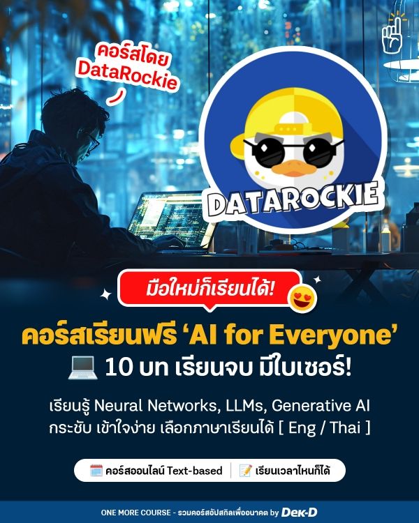 วันนี้ One More Course ขอมาป้ายยาคอร์สเรียนฟรี วิชา ‘AI for Everyone’ จัดทำโดย ‘แอดทอย’ Data Analyst ตัวตึงเจ้าของเพจ Data Rockie ที่ได้กระชับเนื้อหาสำคัญ 10 บทเรียนมาให้ครบ ปูตั้งแต่รากฐานอย่าง Machine Learning, Neural Networks ไปจนถึง Generative AI และ LLMs ที่อยู่เบื้องหลังเครื่องมือตัวดังอย่าง ChatGPT ด้วย