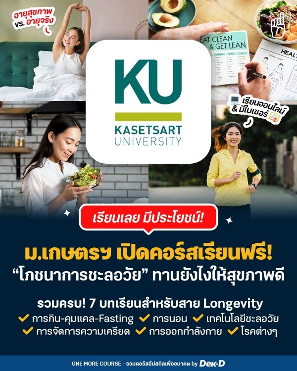 ลืมภาพจำว่าเรื่องชะลอวัยเป็นเรื่องของคนสูงอายุไปได้เลย เทรนด์สุขภาพยุคนี้คือยิ่งดูแลตัวเองไว ยิ่งเป็นกำไรชีวิตแบบไม่มีขาดทุน วันนี้ One More Course เลยขอมาป้ายยาคอร์สฟรี “โภชนาการชะลอวัย” จากมหาวิทยาลัยเกษตรศาสตร์ ที่เค้าไม่ได้สอนแค่การกินคลีนจืดๆ แต่จะพาไปเจาะลึกศาสตร์การชะลอวัยในรูปแบบต่างๆ ครบทั้งเรื่องการกิน การนอน การออกกำลังกาย รวมถึงเทคโนโลยีใหม่ๆ เนื้อหาย่อยง่าย ปรับใช้ได้ยาวๆ!