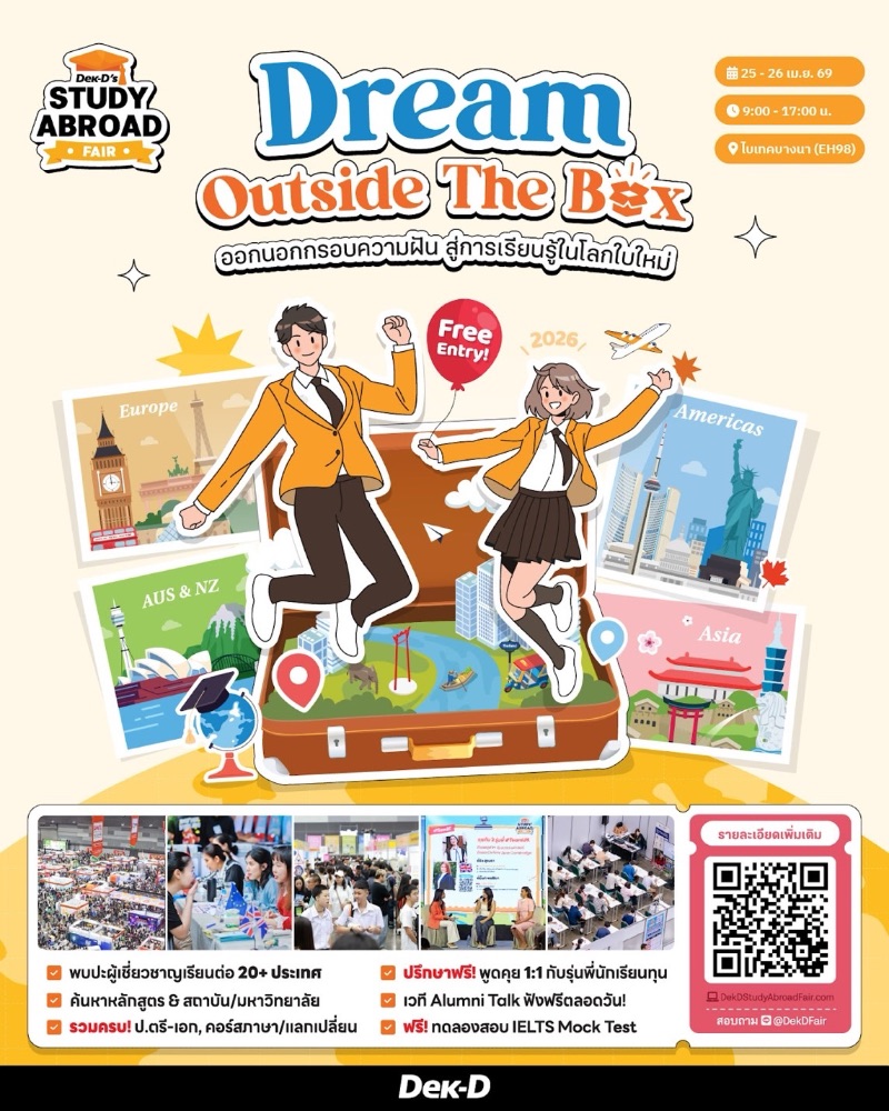 เริ่มปลดล็อกความฝันเรียนต่อต่างประเทศไปกับงานแฟร์ใหญ่รับซัมเมอร์ “Dek-D’s Study Abroad Fair 2026” งานเดียวที่รวมทุกตัวช่วยสำหรับคนอยากเรียนต่อนอก ไม่ว่าจะกำลังหาข้อมูล วางแผนอนาคต หรืออยากพูดคุยกับรุ่นพี่และที่ปรึกษาตัวจริง