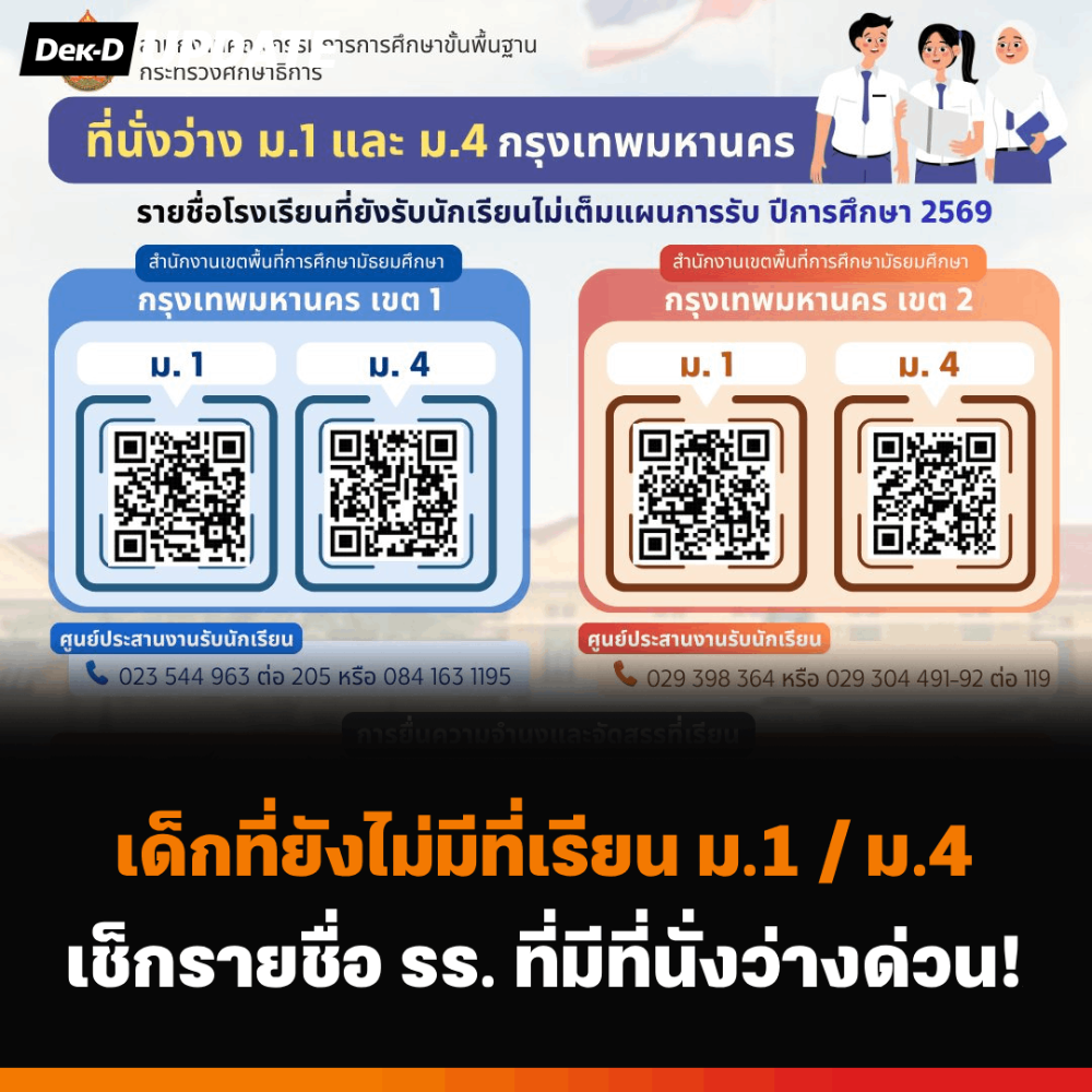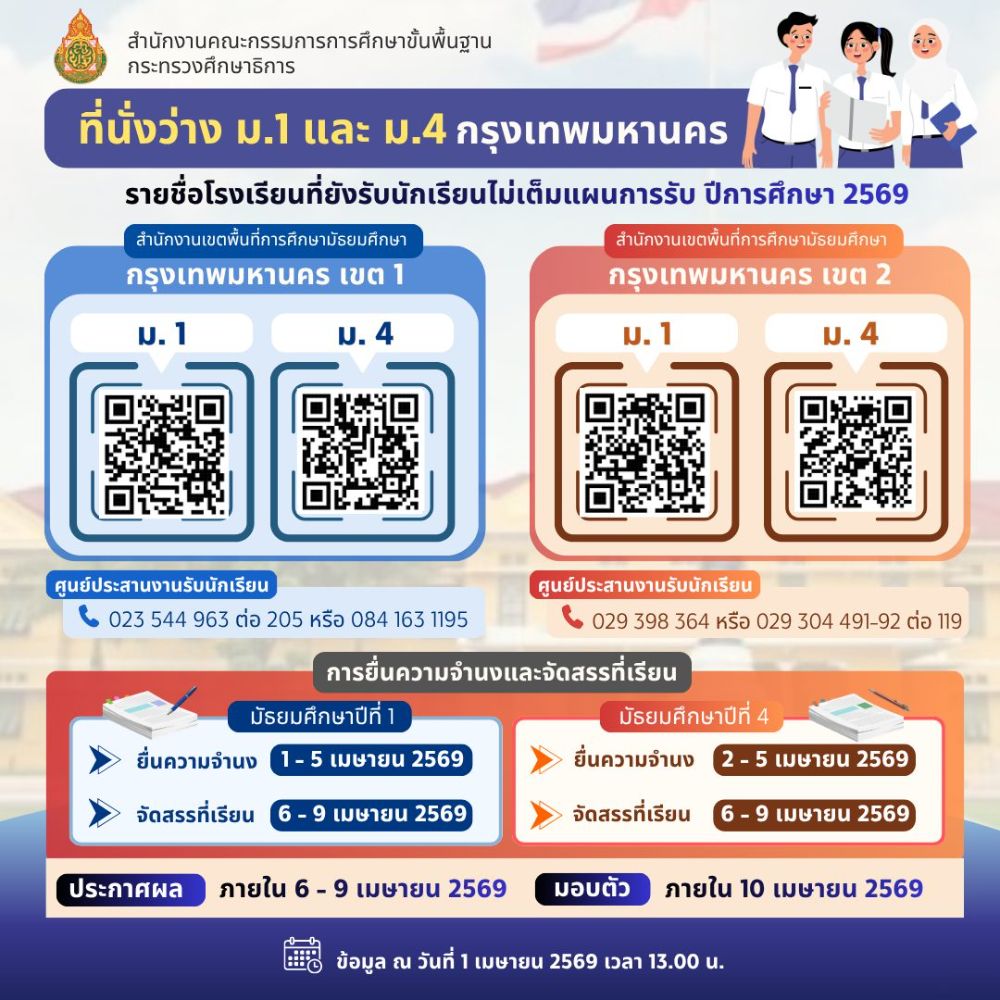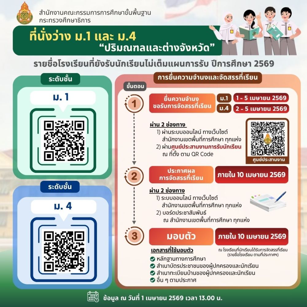 การสอบเข้าเรียนต่อระดับ ม.1 และ ม.4 ประกาศผลไปแล้ว แต่สำหรับนักเรียนที่ยังไม่มีที่เรียน สำนักงานคณะกรรมการการศึกษาขั้นพื้นฐาน (สพฐ.) ออกประกาศ ให้เด็กที่ยังไม่มีที่เรียน ประจำปีการศึกษา 2569 ตรวจสอบรายชื่อโรงเรียนที่มีที่นั่งว่าง โดยการสแกน QR Code และยื่นความจำนง ได้ที่สำนักงานเขตพื้นที่การศึกษา ใกล้บ้าน