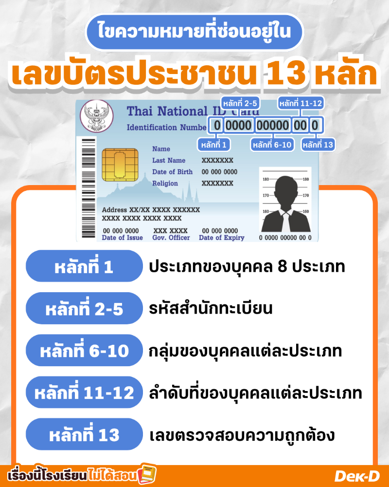 วันนี้เชื่อว่า น้อง ๆ ชาว DEK-D ทุกคนคงจะได้ไขข้อข้องใจในความหมายของเลขบัตรประชาชนทั้ง 13 หลัก และได้รู้ถึงความสำคัญของตัวเลขนี้กันแล้วนะคะ อ่านมาถึงตรงนี้แล้ว ลองหยิบบัตรประชาชนของตัวเองขึ้นมาพลิกดูตัวเลข 13 หลักกันนะคะ :D