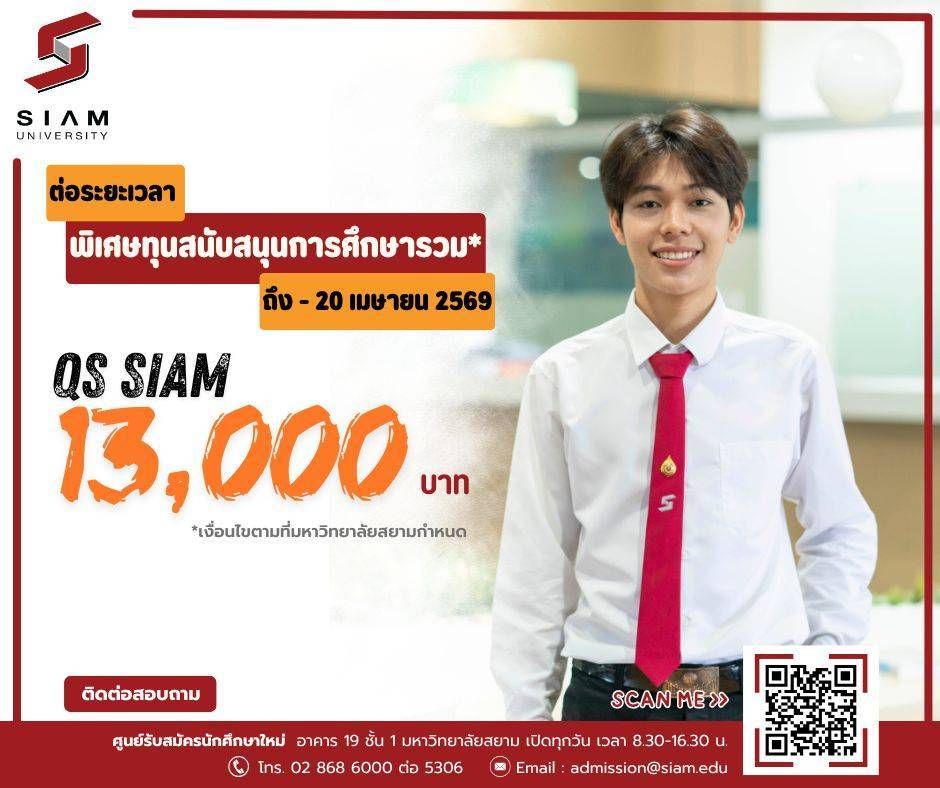 มหาวิทยาลัยสยาม ขอเชิญชวนนักเรียนผู้ที่สนใจศึกษาต่อในระดับอุดมศึกษา สมัครเข้าศึกษาต่อเป็นนักศึกษาใหม่ ประจำปีการศึกษา 2569 โดยเปิดโอกาสพิเศษมอบ ทุนสนับสนุนการศึกษาสูงสุด 13,000 บาท ** เงื่อนไขเป็นไปตามที่มหาวิทยาลัยกำหนด