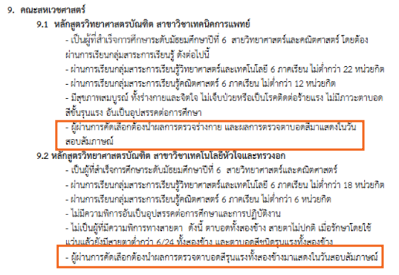 - กำหนดวิชา TGAT, คณิตศาสตร์ 1, ฟิสิกส์, ชีววิทยา, ภาษาอังกฤษ แต่ละวิชา ≥ 25 คะแนน