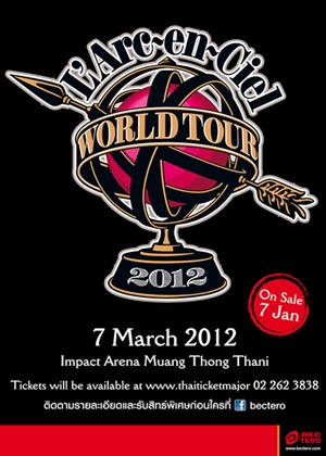 น้องๆ ชาว Dek-D.com ที่เป็นคอ J-Rock เตรียมฟิตซ้อมร่างกายให้พร้อม แล้วไปสนุกสุดมันส์กันในคอนเสิร์ต LArc~en~Ciel WORLD TOUR 2012 in Bangkok ที่จะระเบิดความมันส์กันในวันพุธที่ 7 มีนาคมนี้ ที่ อิมแพ็ค อารีน่า เมืองทองธานี LArc~en~Ciel ถือว่าเป็นสุดยอดวง Rock จากประเทศญี่ปุ่นอีกหนึ่งวง ที่แฟนเพลงชาวไทยต่างเฝ้ารอการมาเยือนของพวกเขาอย่างใจจดใจจ่อ และอยากที่จะสัมผัสประสบการณ์ความมันส์กับการแสดงสด โดยสมาชิกในวงประกอบด้วย เท็ตสึ (tetsu) หัวหน้าวงและมือเบส, ไฮด์ (hyde) นักร้องนำ, เคน (ken) กีตาร์ และ ยูกิฮิโระ (yukihiro) กลอง ซึ่งหลังจากได้ประกาศ WORLD TOUR 2012 ก็ทำให้แฟนเพลงที่อยู่ทั่วทุกมุมโลกได้หายคิดถึง และประเทศไทยก็เป็นอีกหนึ่งประเทศที่พวกเขาจะเดินทางมาเยือน โดย WORLD TOUR 2012 จะเปิดฉากกันที่ฮ่องกง ก่อนที่จะมากรุงเทพฯ บ้านเรา จากนั้นก็ไปที่ เซี่ยงไฮ้, ไทเป, นิวยอร์ก, ลอนดอน และปารีส ซึ่ง ลาร์ค ออง เซียล เป็นศิลปินญี่ปุ่นวงแรกที่ได้แสดงคอนเสิร์ตที่ เมดิสัน สแควร์ การ์เด้นท์ ในนิวยอร์กด้วย การเดินอยู่บนเส้นทางสายดนตรีของพวกเขากว่า 20 ปี กับผลงานที่มีออกมาอย่างต่อเนื่อง และได้รับรางวัลมากมายนับตั้งแต่ก่อตั้งวงขึ้น ซึ่งถือเป็นเครื่องหมายการันตีถึงประสบการณ์ทางดนตรีของพวกเขาได้เป็นอย่างดี ในปี 2011 พวกเขาประสบความสำเร็จกับคอนเสิร์ตฉลองครบรอบ 20 ปีของวง อย่างสูงสุด และเวิลด์ ทัวร์ในปี 2012 ที่กำลังจะเริ่มขึ้น แน่นอนว่าทุกคนจะได้ทั้งมันส์และซึ้งไปกับเพลงฮิตที่มีอยู่มากมาย อย่างเพลง Ready Stay Go, Stay Away, Drivers High, Anata, Bless, Heavens Drive, Good Luck My Way, Hitomi no Juunin, MY HEART DRAWS A DREAM รวมถึงเพลง Niji ที่เปรียบสเมือนเพลงประจำวงของ LArc~en~Ciel และอีกหลายๆ เพลงที่แฟนเพลงชาวไทยรู้จักกันดี และร้องตามกันได้อย่างแน่นอน