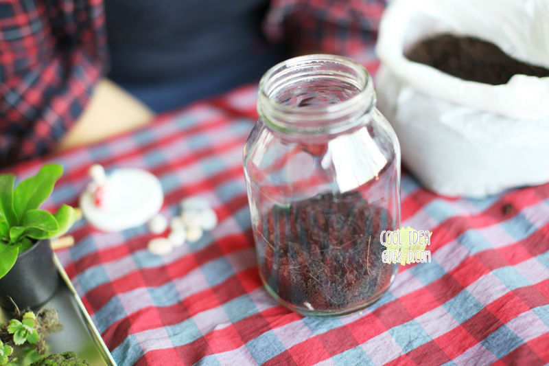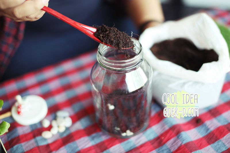 2. แล้วก็ใส่ดินลงไปสูงประมาณ 1/3 ส่วนของขวด