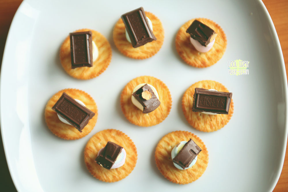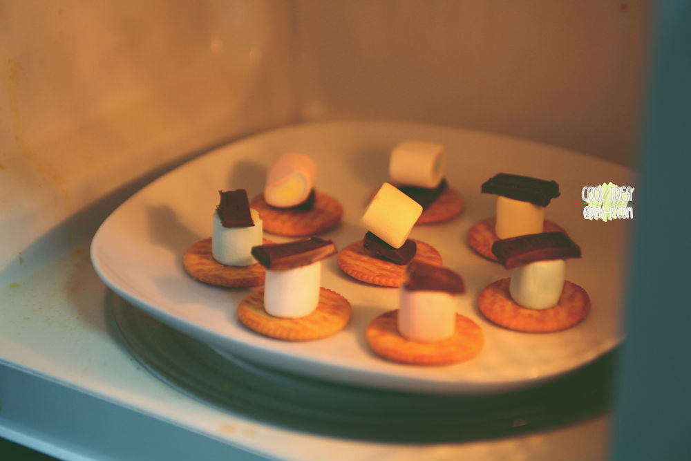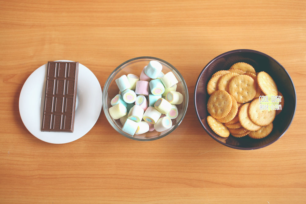 เราเอามาร์ชเมลโล่ไปปิ้งแล้วก็เอาช็อกโกแลตวางทับในแคร็กเกอร์เลย เพราะไม่ต้องใช้ไมโครเวฟ =0=