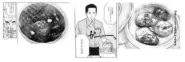 ขนมจีน และ แกงน้ำผลไม้ ก็เป็นหนึ่งในอาหารไทยที่การ์ตูนเรื่อง สูตรฮิตเมนูฮ็อต (Addict to Curry) นำมาเสนอด้วย นอกจากนี้ เรายังเห็นตัวอักษรไทยในคำว่า "แกง" จากเรื่องนี้อีกต่างหาก |